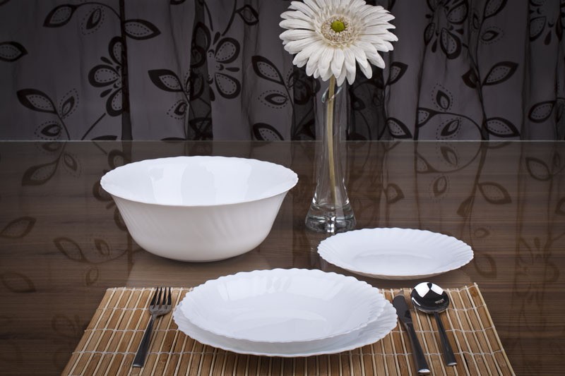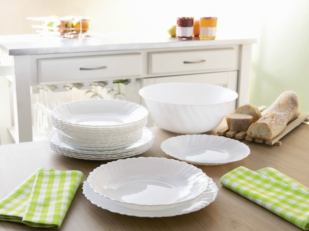 Подкупает белоснежный набор посуды и количество предметов! Только чашечки не понравились,совсем маленькие! И снаружи чашечки матовые. Произведена посуда в Эмиратах.