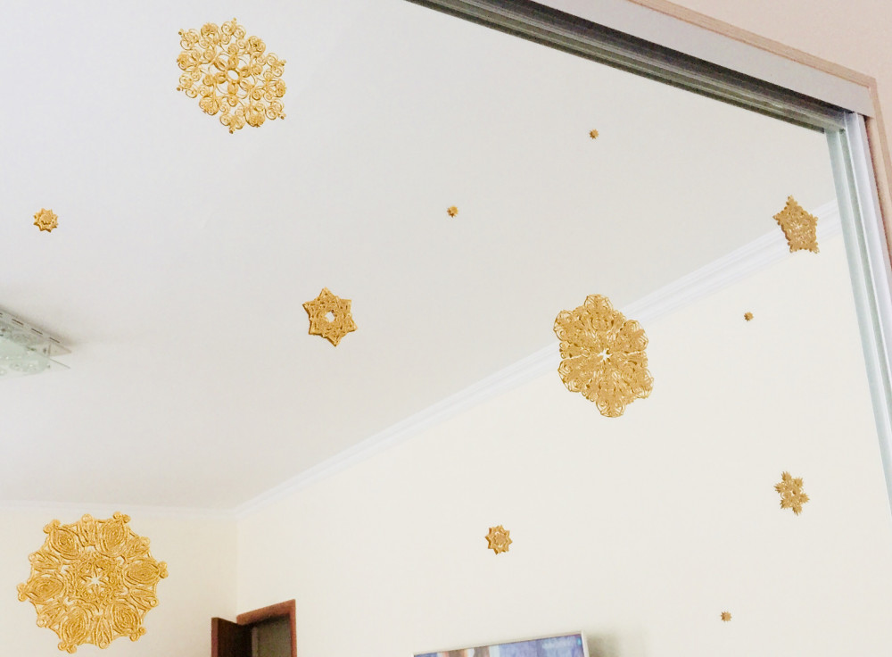 Классные снежинки, золотые ярче, чем остальные. Их много на листе, многоразовые. Доставка быстрая, я думала не успеют до НГ, но команда Flip - молодцы!