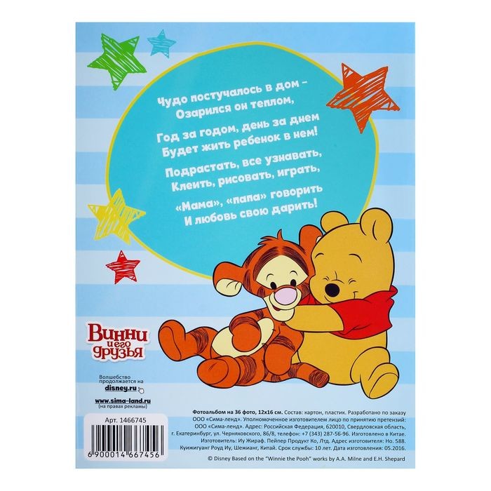 Disney Фотоальбом на 36 фото с наклейками «Мои первые фото»В данный момент этот товар отсутствует в продаже. Возможно, у нас найдется аналогичный или похожий товар здесь. Серия: Медвежонок Винни и его друзья Фотоальбом на 36 фото с накл."Мои первые фото«Дисней Бейби Медвежонок Винни и его друзья — сувенир в полном смысле этого слова. В переводе с французского souvenir означает «воспоминание». И главная задача любого сувенира — хранить воспоминание о месте, где вы побывали, или о том человеке, который подарил данный предмет. |