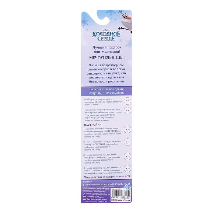 Disney Часы наручные электронные «Холодное сердце»В данный момент этот товар отсутствует в продаже. Возможно, у нас найдется аналогичный или похожий товар здесь. Серия: Холодное сердце Все дети хотят поскорее повзрослеть, иметь свою машину, мобильный телефон и, конечно же, наручные часы, как у мамы и папы. Подарите чаду часы наручные электронные «Холодное сердце», Холодное сердце с изображением любимых героев Disney, и он будет прыгать от восторга! Все друзья будут завидовать такому красивому и функциональному аксессуару, а ребёнок научится следить за временем. Дети быстро растут, а благодаря безразмерному браслету-ремешку изделие долго будет в пору. Здесь нет мелких застёжек, поэтому малыш сможет надевать часы без помощи родителей. Часы из пластика не разобьются, если упадут. На экране отображается время, а также число и месяц. В устройство встроен секундомер. |