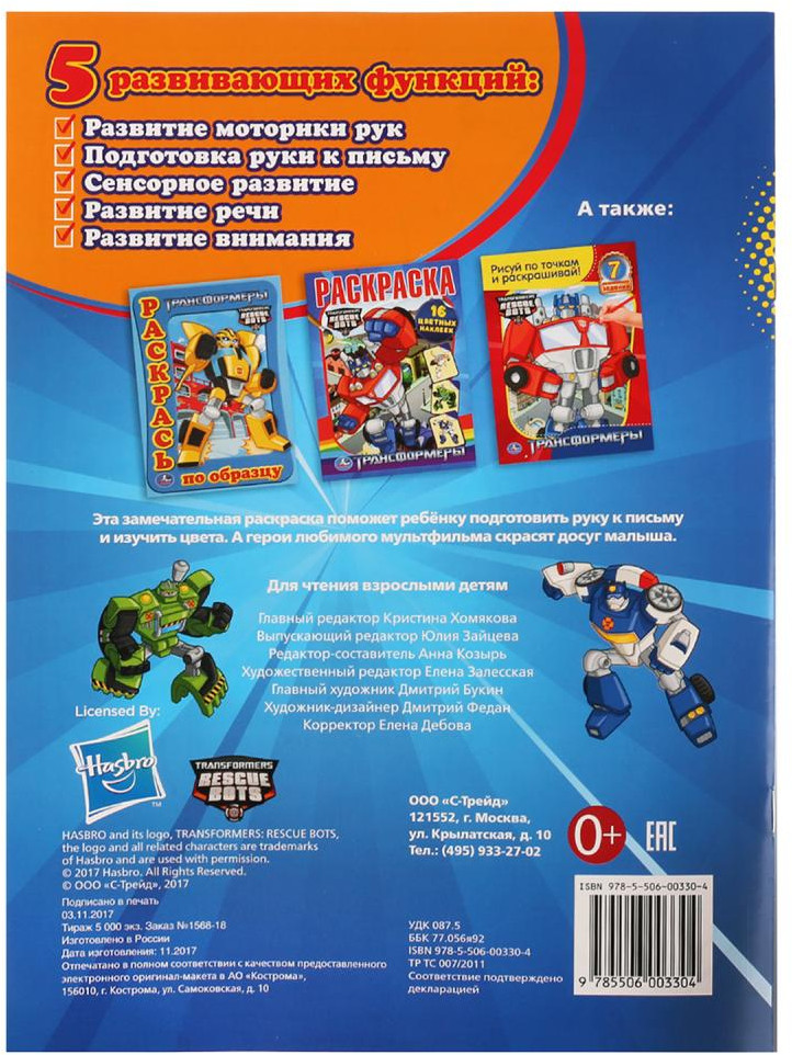 УМка ТрансформерыВ данный момент этот товар отсутствует в продаже. Возможно, у нас найдется аналогичный или похожий товар здесь. Любимые герои мультфильмов теперь на страницах раскрасок! Раскраска будет прекрасным подарком для ребенка. Она сделана по мотивам любимого мультфильма «Трансформеры». На страницах раскраски ребенок встретит известных героев. которых нужно раскрасить. Развивает фантазию, моторику, координацию, память. |