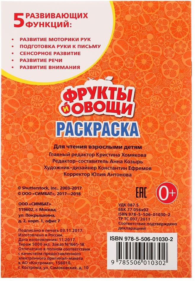 УМка Фрукты и овощи. Первая раскраскаВ данный момент этот товар отсутствует в продаже. Возможно, у нас найдется аналогичный или похожий товар здесь. Серия: Первая раскраска Эта замечательная раскраска «Фрукты и овощи» из серии «Первая раскраска» поможет ребёнку подготовить руку к письму и изучить цвета. Так же в этой раскраске малыш найдет и изучит виды фруктов и овощей, которые сможет раскрасить как захочется. Развивает мелкую моторику рук, воображение, фантазию. |