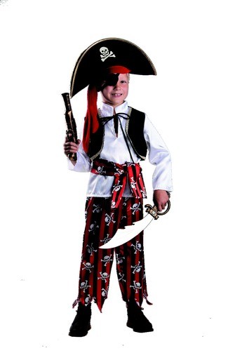 Этот наряд подойдет мальчику, мечтающему о шуме моря, собственном корабле и незабываемых приключениях. В комплект входят рубаха с жилетом, бриджи, пояс, повязка, повязка, шляпа и сабля.