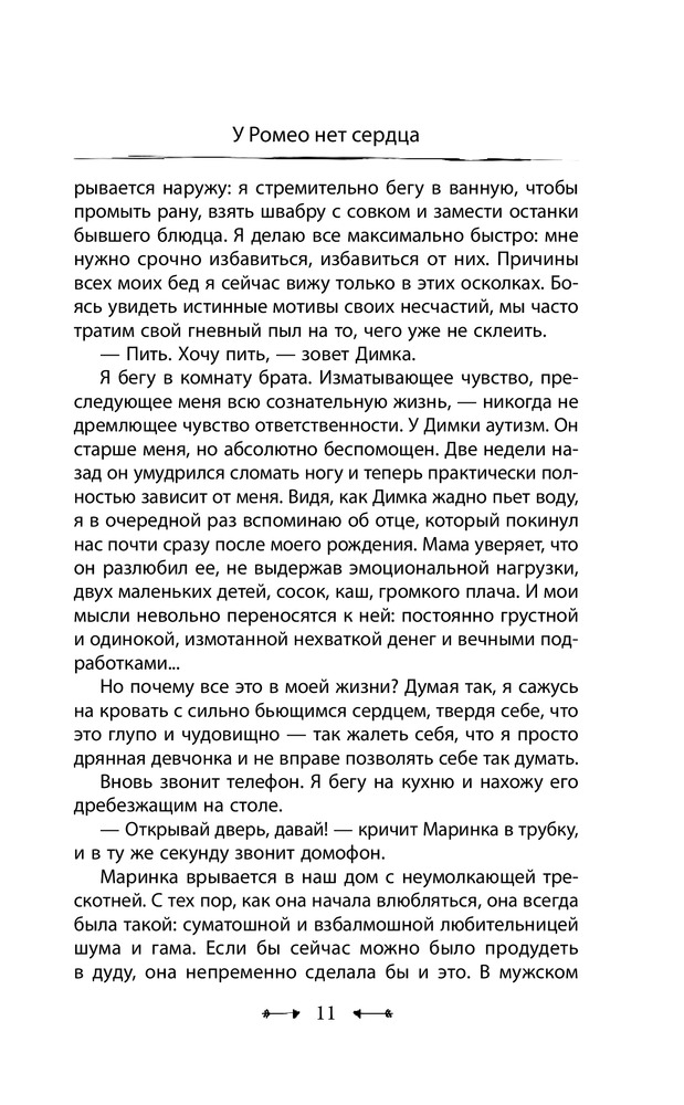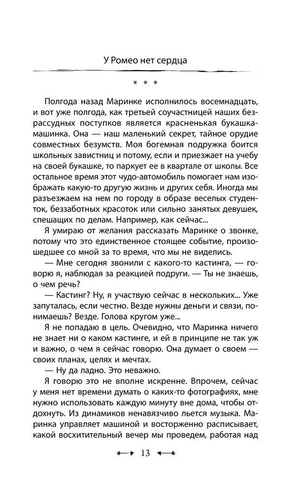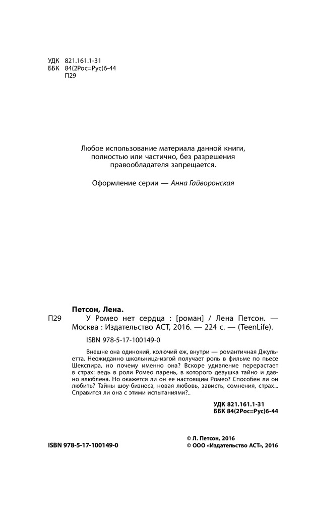 У Ромео нет сердцаВ данный момент этот товар отсутствует в продаже. Возможно, у нас найдется аналогичный или похожий товар здесь. Серия: TeenLife Внешне она одинокий, колючий еж, внутри — романтичная Джульетта. Неожиданно школьница-изгой получает роль в фильме по пьесе Шекспира, но почему именно она? Вскоре удивление перерастает в страх: ведь в роли Ромео парень, в которого девушка тайно и давно влюблена. Но окажется ли он её настоящим Ромео? Способен ли он любить? Тайны шоу-бизнеса, новая любовь, зависть, сомнения, страх... Справится ли она с этими испытаниями? |