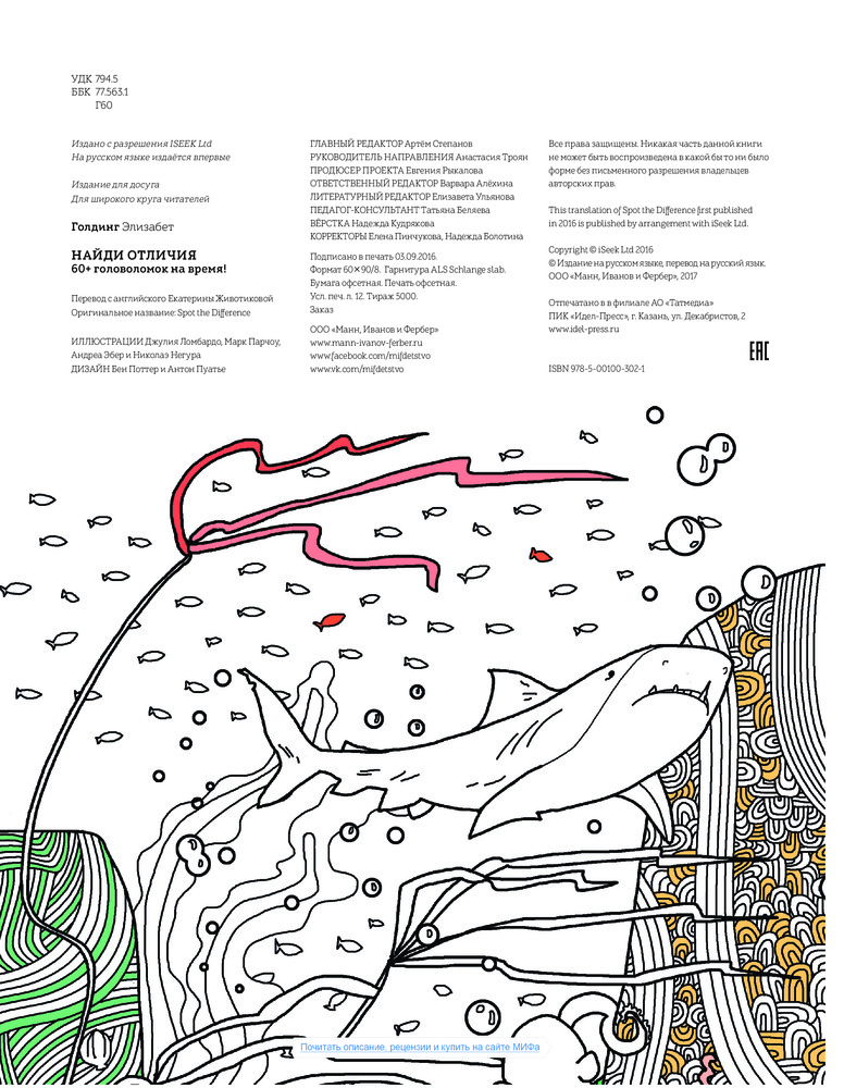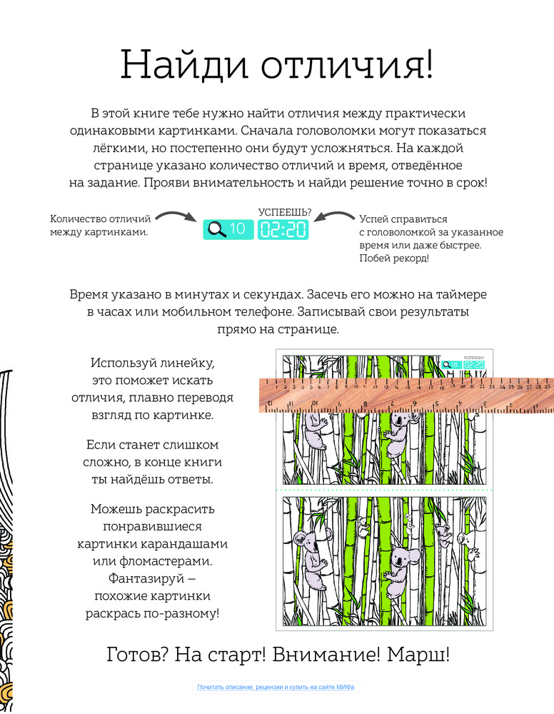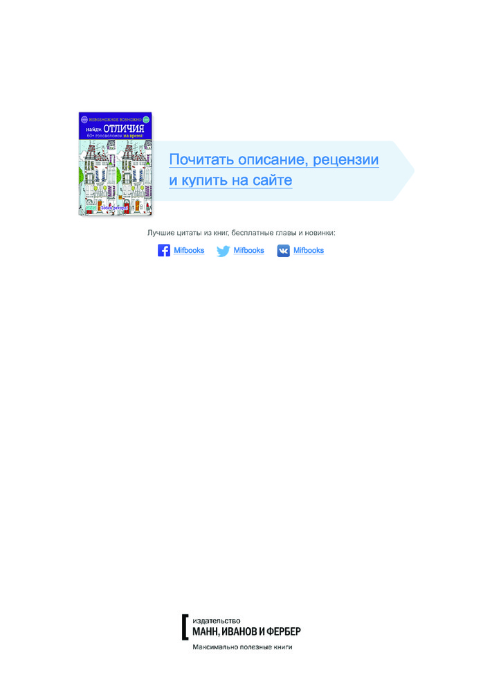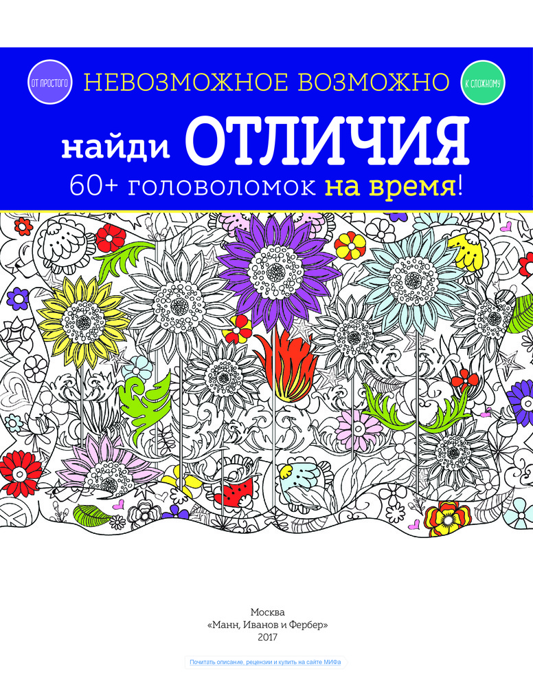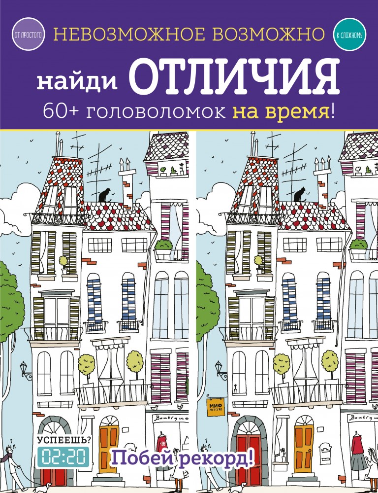 Невозможное возможно. Найди отличияВ данный момент этот товар отсутствует в продаже. Возможно, у нас найдется аналогичный или похожий товар здесь. Серия: МИФ. Детство На страницах этой книги ты встретишь много похожих картинок — отличие лишь в нескольких деталях. Сможешь их найти? Не думай, что это просто: от первых страниц к последним головоломки становятся всё сложнее. Попробуй справиться с ними за указанное время. Успеешь? А получится еще быстрее? Проверь свои силы! У тебя обязательно получится. Не забудь раскрасить понравившиеся картинки восковыми мелками или фломастерами. |