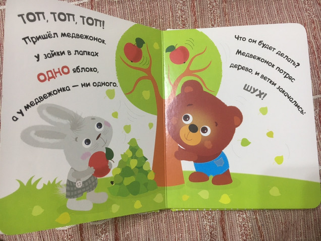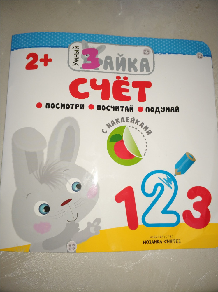 Очень хорошая книжка! Несмотря на то, что переплёт мягкий, он достаточно прочный. Картинки яркие, нарядные. Симпатичный зайка. Интересно построена подача изучаемого счёта. Это не просто цифры, а предметы, сопровождающие соответствующую цифру, и расположенные, например, на дереве. Замечательно и то, что рисунок сопровождается небольшим текстом и звуками. "Умный Зайка. Счёт" просто чудо какая умная книжка! .