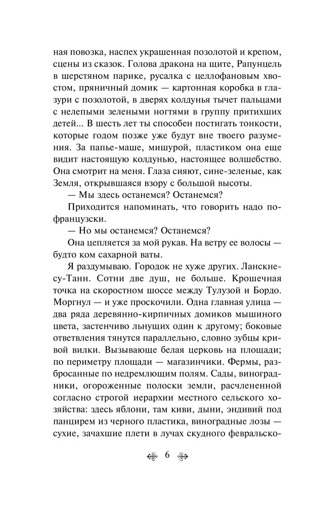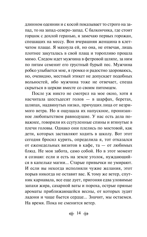 Хочу написать про саму историю. Первый раз прочла залпом, по сравнению с фильмом показалась серой. Второй раз начала перечитывать не торопясь, обдумывая то, что прочла и должна сказать: книга мне очень понравилась. Она о том, что значит быть счастливым, о том, что бороться за счастье никогда не поздно, о том, что не место делает человека счастливым, а он сам и его отношение к жизни. Некоторые моменты про колдовство смущают, но без них, наверное, книга была бы уже не та. Качество обложки хорошее, бумага газетная, но вкусно пахнет и от нее не болят глаза. Советую всем для прочтения. Фильм тоже обязателен для просмотра.