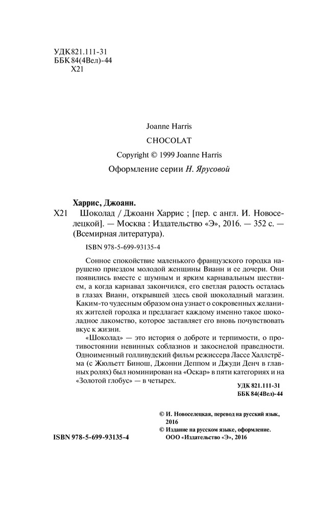 ШоколадВ данный момент этот товар отсутствует в продаже. Возможно, у нас найдется аналогичный или похожий товар здесь. Серия: Всемирная литература Сонное спокойствие маленького французского городка нарушено приездом молодой женщины Вианн и ее дочери. Они появились вместе с шумным и ярким карнавальным шествием, а когда карнавал закончился, его светлая радость осталась в глазах Вианн, открывшей здесь свой шоколадный магазин. Каким-то чудесным образом она узнает о сокровенных желаниях жителей городка и предлагает каждому именно такое шоколадное лакомство, которое заставляет его вновь почувствовать вкус к жизни. |
