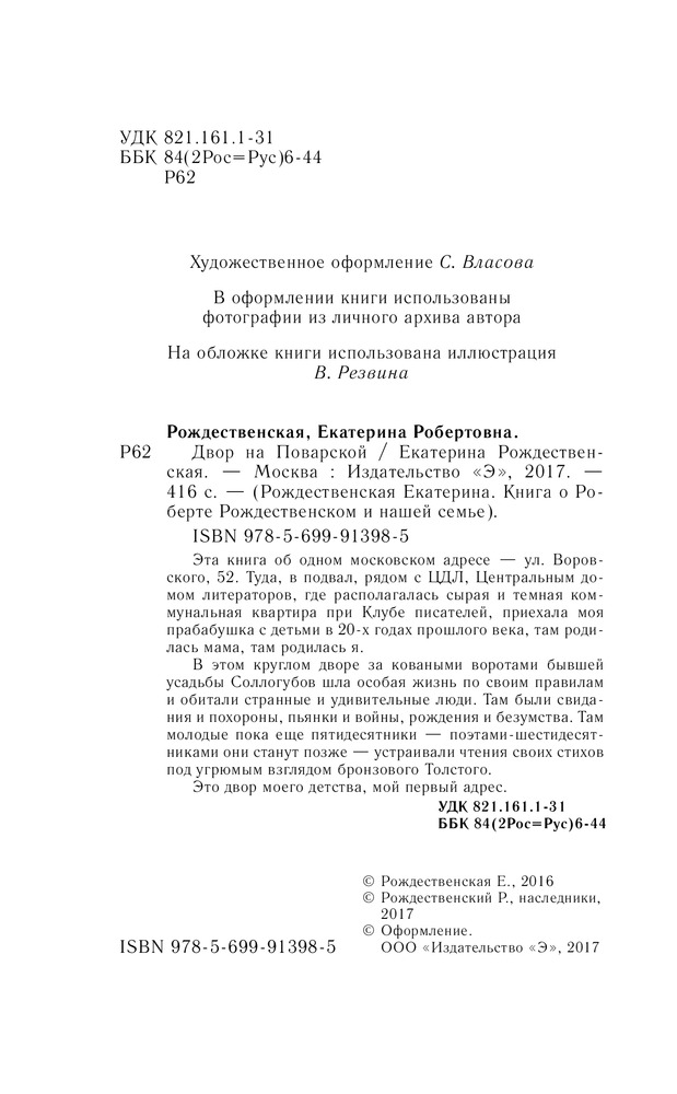 В данный момент этот товар отсутствует в продаже. Возможно, у нас найдется аналогичный или похожий товар здесь. Серия: Книга о Роберте Рождественском и нашей семье Эта книга об одном московском адресе — ул. Воровского, 52. Туда, в подвал, рядом с ЦДЛ, Центральным Домом Литераторов, где располагалась сырая и темная коммунальная квартира при Клубе писателей, приехала моя прабабушка с детьми в 20х годах прошлого века, там родилась мама, там родилась я.