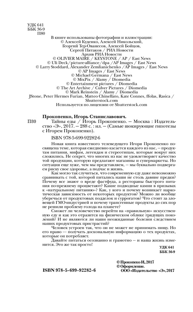 Тайны едыИгорь Станиславович Прокопенко В данный момент этот товар отсутствует в продаже. Возможно, у нас найдется аналогичный или похожий товар здесь. Серия: Самые шокирующие гипотезы с Игорем Прокопенко Новая книга известного телеведущего Игоря Прокопенко посвящена теме, которая ежедневно касается каждого из нас — продуктам питания, мифам, легендам и стереотипам, которые вокруг них сложились. Не секрет, что многих из нас не удовлетворяет качество той продукции, которую предлагают магазины и супермаркеты. Но ситуация еще хуже, чем мы представляем — мы буквально подвергаем риску свое здоровье, а подчас и жизнь. |