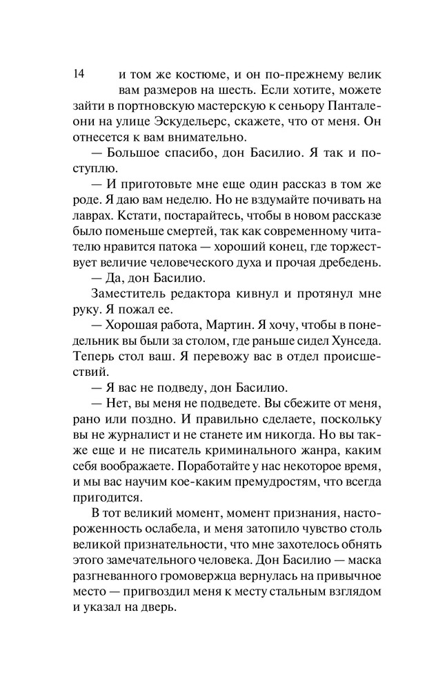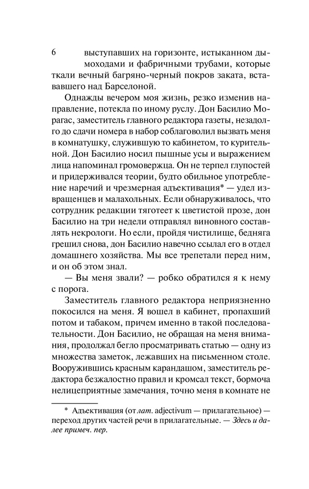 Замечательная история и очень атмосферный персонаж. Ещё интереснее история развивается в следующих томах цикла, местами аж голова идёт .Уже прочитал весь цикл и буду дальше читать книги Автора. Теперь появилось исполинское желание в будущем поехать в Испанию в Барселону и посмотреть на этот, замечательно и загадочно описанный в книгах Сафона, город. В общем всем желаю возможность насладиться как минимум этой книгой, а если понравится то и остальными томами из цикла. Смотрю иногда видео про книги, но ещё ни разу не встречал что бы кто-нибудь отзывался об этом Авторе. Как будто все проходят мимо и не замечают такого талантливого писателя, В этой книге я с удовольствием оставлю частицу своей души))).