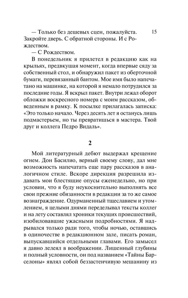 Первой у Сафона прочитала "Тень ветра", поддавшись на рекламу о том, что это лучший писатель Испании последнего десятилетия и книга пропитана атмосферой Барселоны. Та книга не понравилась совсем, примитивный сюжет с каким-то намеком на тайну. За атмосферу Барселоны, видимо, было принято перечисление названий улиц, по которым бродил герой. Решила, что этого автора я больше не читаю. Но по прошествии времени купила "Тень ветра". Эта книга понравилась очень, не могла оторваться, пока не дочитала до конца.