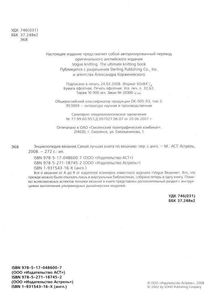 Энциклопедия вязания. Самая лучшая книга по вязаниюВ данный момент этот товар отсутствует в продаже. Возможно, у нас найдется аналогичный или похожий товар здесь. Все о вязании от А до Я от издателей всемирно известного журнала "Vogue Вязание". Все, что прежде можно было отыскать лишь в виртуальных библиотеках, собрано теперь в одну книгу. Помимо всевозможных аспектов техники вязания в книге представлен дополнительный раздел с инструкциями выполнения ультрамодных дизайнерских моделей. |