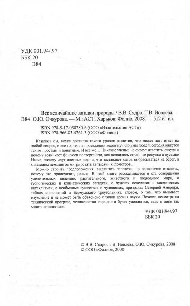 Все величайшие загадки природыТатьяна Васильевна Иовлева, Оксана Юрьевна Очкурова, Владимир Владимирович Сядро В данный момент этот товар отсутствует в продаже. Возможно, у нас найдется аналогичный или похожий товар здесь. Казалось бы, наука достигла такого уровня развития, что может дать ответ на любой вопрос, и все то, что на протяжении веков мучило умы людей, сегодня кажется таким простым и понятным. И все же… Никакие ученые не смогут ответить, откуда и почему возникает феномен полтергейста, как появились странные рисунки в пустыне Наска, почему идут цветные дожди, что заставляет китов выбрасываться на берег, а миллионы леммингов мигрировать за тысячи километров… |