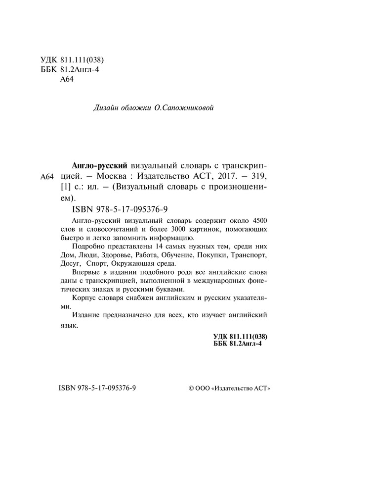 💳 Оплатить за товар можно при получении 🇰🇿 Есть бесплатная доставка по Казахстану 🎁 Копите бонусы с каждой покупки Серия: Визуальный словарь с произношением Англо-русский визуальный словарь содержит около 4500 слов и словосочетаний и более 3000 картинок, помогающих быстро и легко запомнить информацию. Подробно представлены 14 самых нужных тем, среди них Дом, Люди, Здоровье, Работа, Обучение, Покупки, Транспорт, Досуг, Спорт, Окружающая среда. Впервые в издании подобного рода все английские слова даны с транскрипцией, выполненной в международных фонетических знаках и русскими буквами. Корпус словаря снабжен английским и русским указателями. Издание предназначено для всех, кто изучает английский язык. |