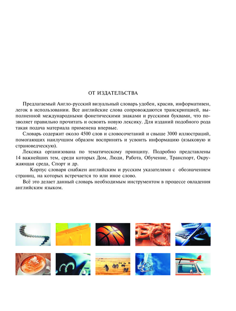 Книга "Англо-русский визуальный словарь" очень понравилась по качеству, переплету и содержанию самого словаря. Имеется русская транскрипция для тех, кто не знает английского языка. Иллюстрации очень красочные, бумага плотная. Именно такой словарь хотелось приобрести, спасибо, Flip.kz.