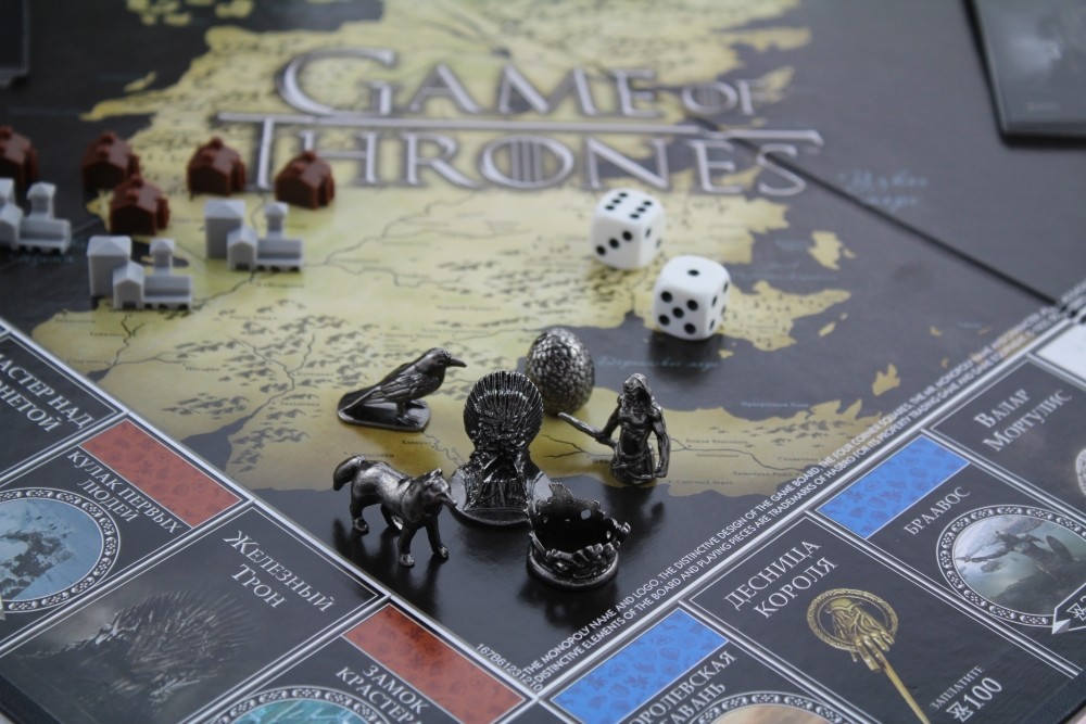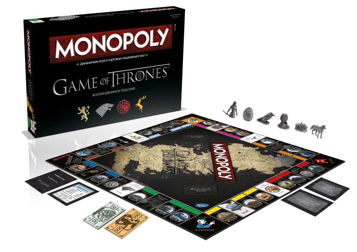 В комплект Монополии: «Игра престолов» входят коллекционные фишки: лютоволк, яйцо дракона, белый ходок, трехглазый ворон, корона и железный трон. Вместо обычных домов и отелей — деревни и крепости. Вместо стандартного игрового поля, теперь оно будет состоять из знакомых для поклонников 7 королевств локаций. Железнодорожные станции заменены на Великие Дома из сериала. Все задания взяты из сюжета сериала или книги.