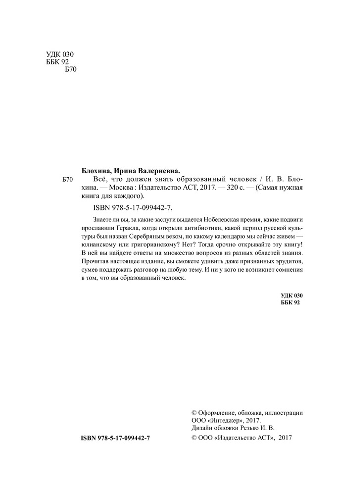 Всё, что должен знать образованный человекВ данный момент этот товар отсутствует в продаже. Возможно, у нас найдется аналогичный или похожий товар здесь. Серия: Самая нужная книга для каждого Знаете ли вы, за какие заслуги выдается Нобелевская премия, какие подвиги прославили Геракла, когда открыли антибиотики, какой период русской культуры был назван Серебряным веком, по какому календарю мы сейчас живем — юлианскому или грегорианскому? Нет? Тогда срочно открывайте эту книгу! В ней вы найдете ответы на множество вопросов из разных областей знаний. Прочитав настоящее издание, вы сможете удивить даже признанных эрудитов, сумев поддержать разговор на любую тему. И ни у кого не возникнет сомнения в том, что вы образованный человек. |