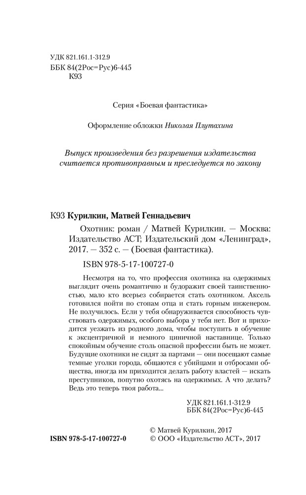 💳 Оплатить за товар можно при получении 🇰🇿 Есть бесплатная доставка по Казахстану от 1 дня 🎁 Копите бонусы с каждой покупки Серия: Боевая фантастика Несмотря на то, что профессия охотника на одержимых выглядит очень романтично и будоражит своей таинственностью, мало кто всерьез собирается стать охотником. Аксель готовился пойти по стопам отца и стать горным инженером. Не получилось. Если у тебя обнаруживается способность чувствовать одержимых, особого выбора у тебя нет. Вот и приходится уезжать из родного дома, чтобы поступить в обучение |