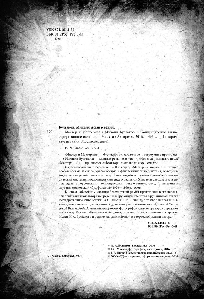 Оценка, якобы "подарочного коллекционного издания" отрицательная - МИНУС 100! Получила книгу и расстроилась! На редкость страшное издание! Якобы обожженные листы грязно-черно серой бумаги и на них текст! Немного фото Булгаковых. Оформление депрессивное на редкость. Гадость! Ставлю одну звездочку, чтобы потенциальные покупатели обратили внимание на отзыв и не попадались на такие "подарочные" и коллекционные издания.