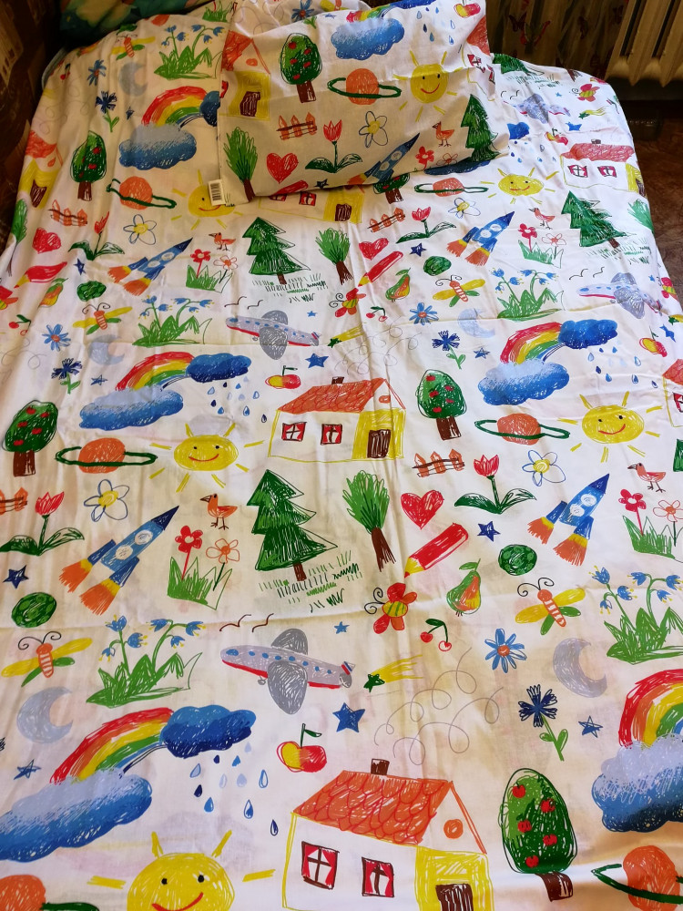Постельный комплект нам очень понравился. Яркий, красочный, как раз к лету! Спасибо за первый отзыв. Очень рассчитывали, что наволочка тоже будет цветная, а не как на фото. Так и вышло. Вот только простынь, на мой взгляд, была бы интереснее желтого, зеленого или красного цвета. Ну да ладно. Качество тоже понравилось. Ребенок с удовольствием пользуется! Доставка сроками порадовала.