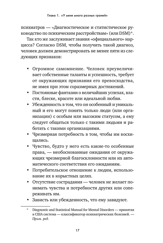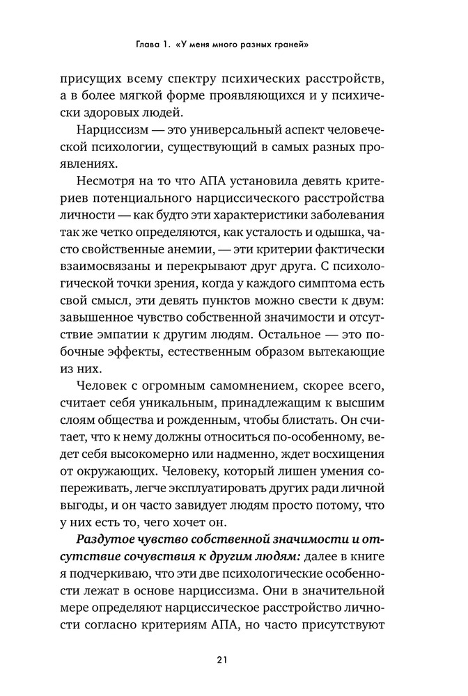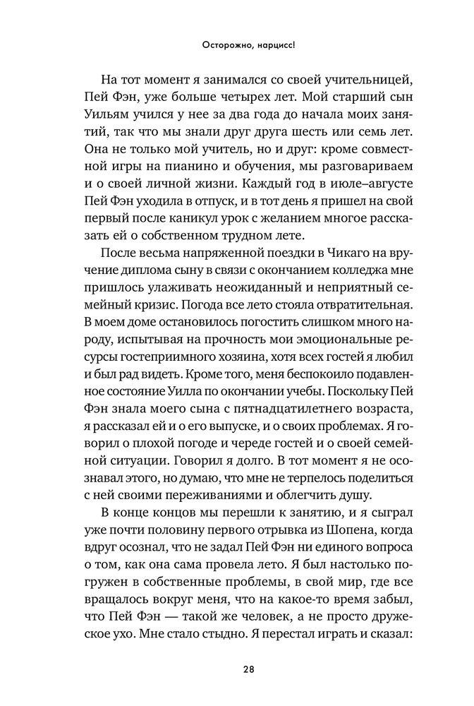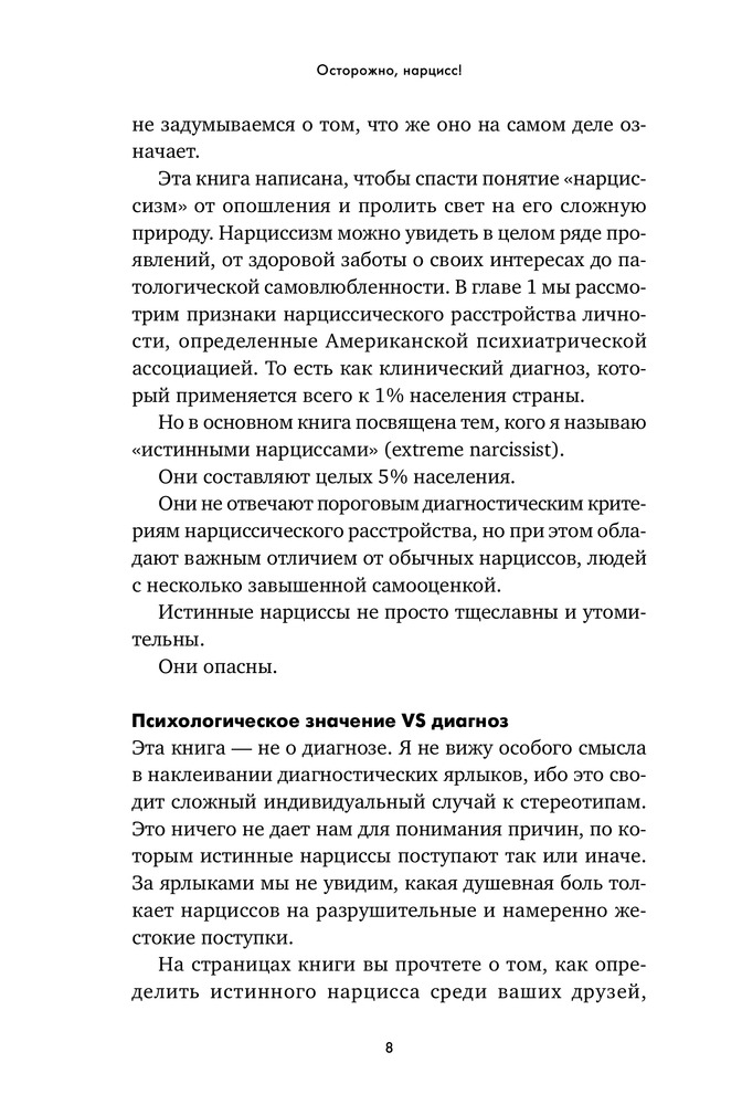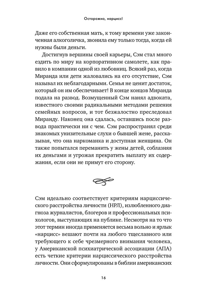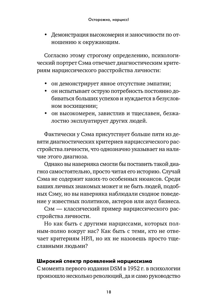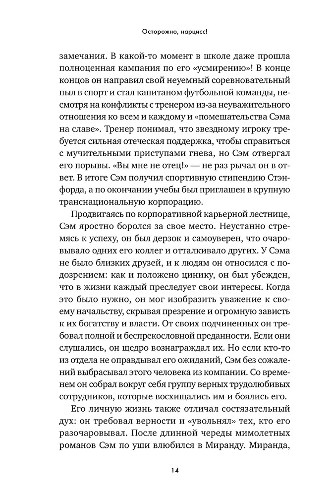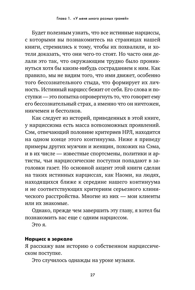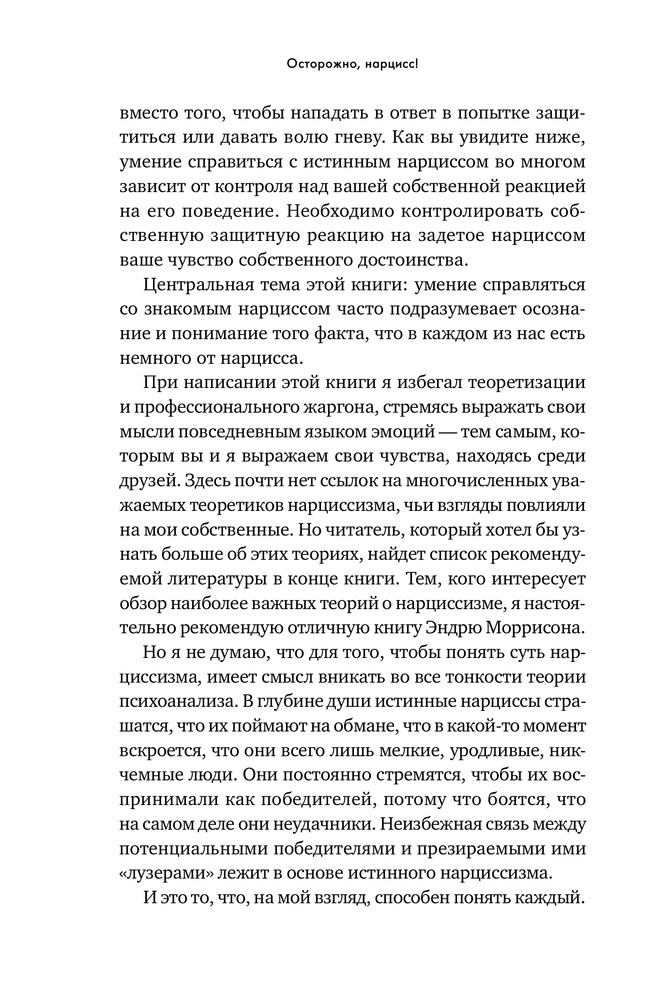 Осторожно, нарцисс! Как вести себя с этими самовлюбленными типамиВ данный момент этот товар отсутствует в продаже. Возможно, у нас найдется аналогичный или похожий товар здесь. «Нарцисс» — дежурный диагноз ученых мужей и журналистов. Его с легкостью раздают как знаменитостям, попавшим в скандальную историю, так и политикам, уличенным в неблаговидных поступках. Люди употребляют это слово как оскорбление, чтобы „спустить на землю“ человека, чье самомнение, на их взгляд, слишком высоко. Мы называем так мужчин и женщин любых социальных слоев — от известных актеров, которые поступили некрасиво, будучи в центре внимания общественности, до друзей, которые постоянно выкладывают в „Инстаграм“ удачные фотографии. Такое чувство, что в нарциссов сегодня превратились абсолютно все». |