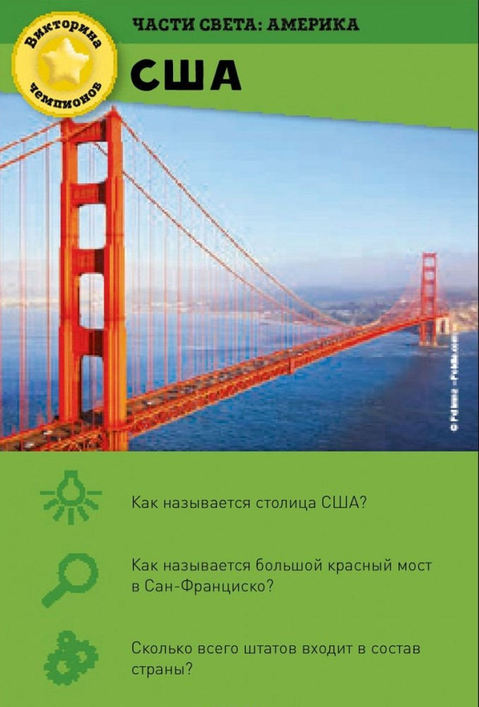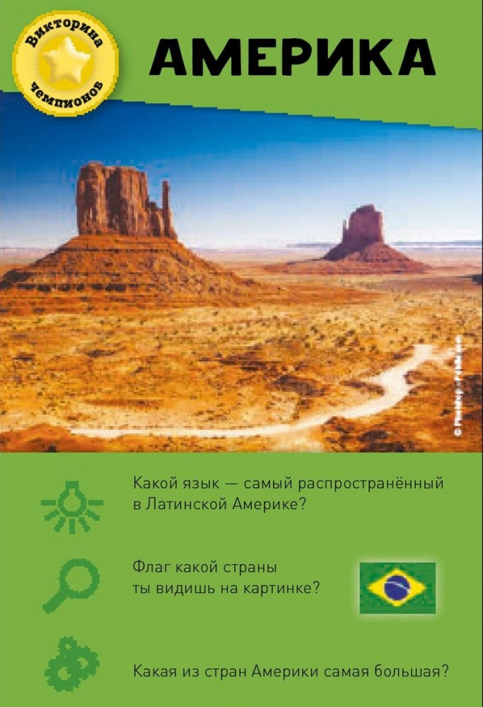 Викторина чемпионов. Страны мираВ данный момент этот товар отсутствует в продаже. Возможно, у нас найдется аналогичный или похожий товар здесь. Серия: Время играть В этом наборе из серии "Викторина чемпионов" вы найдёте 50 карточек с заданиями, которые помогут вашему ребёнку, играя узнать больше о городах и странах. |