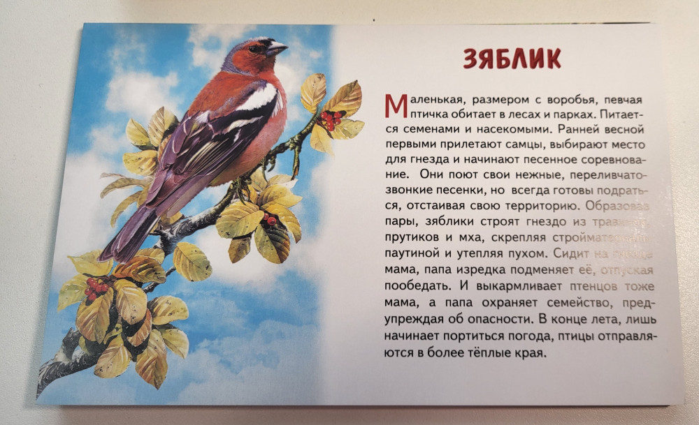 Очень хорошие, красивые и полезные для развития кругозора ребёнка карточки. На каждой карточке имеются описания изображённой на ней птицы. На прогулке видим птиц - и уже узнаём некоторых.