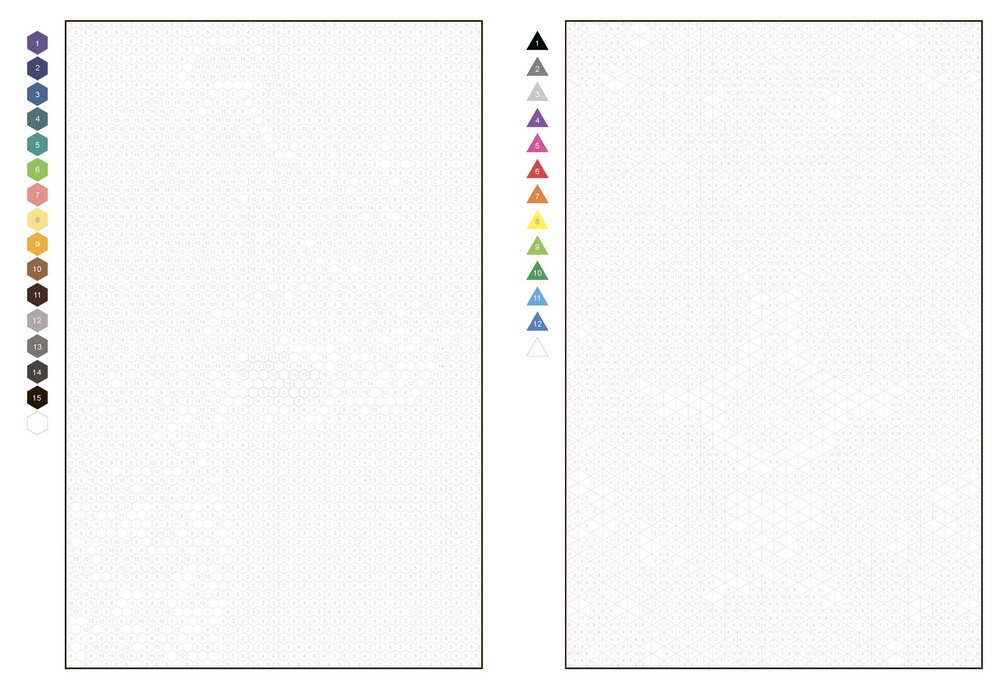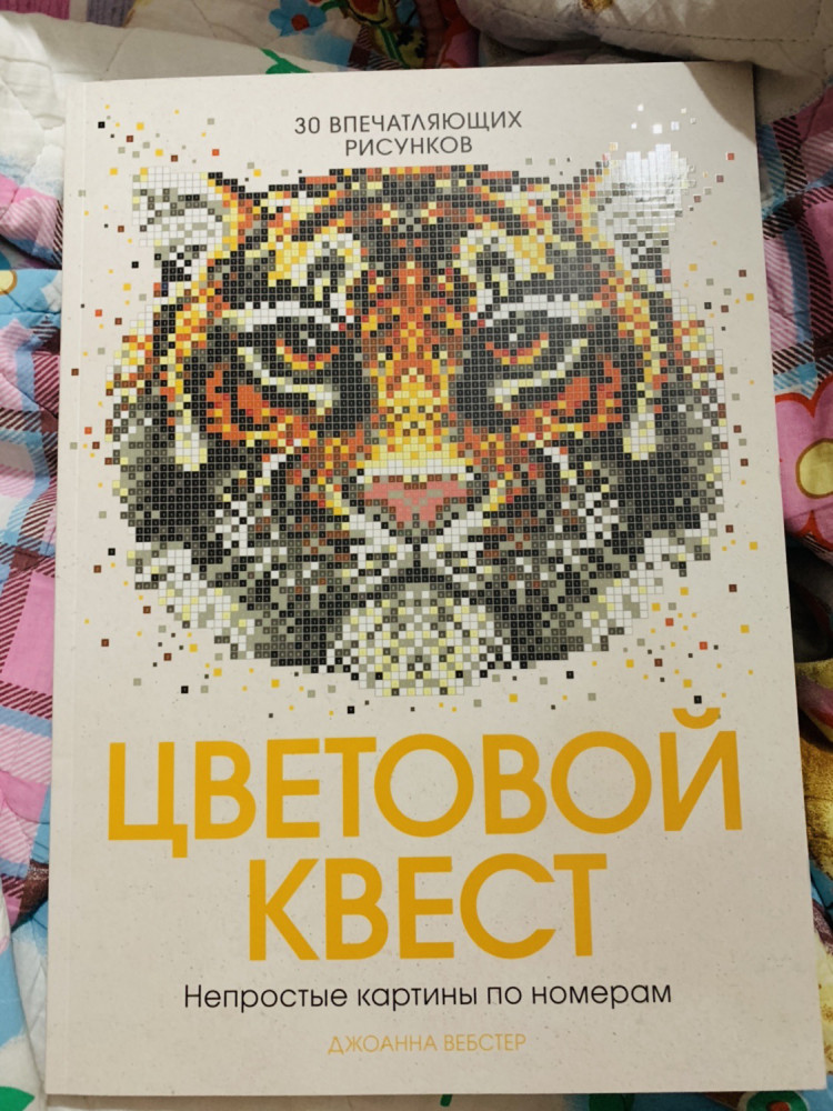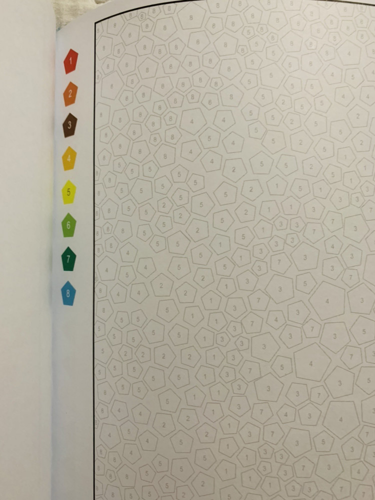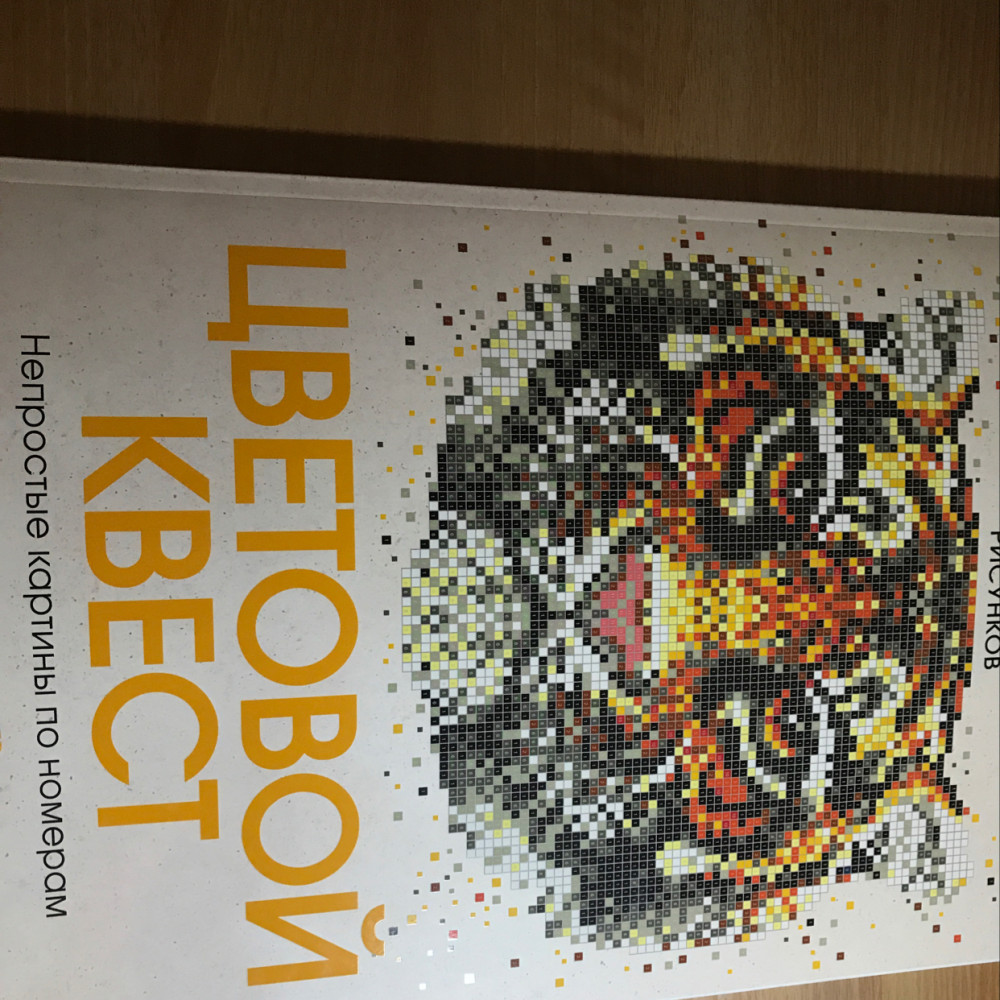 Очень большой формат при небольшой толщине. Каждый рисунок на отдельной странице, на обороте чистый лист. Рисунки поделены на пронумерованные квадратики, шестигранники, треугольники, круги... Очень хорошее и приятное времяпровождение - раскрашивать такие картинки, когда не знаешь что получится в итоге. Напоминает мозаику и рисование по номерам. Есть страницы посложнее, есть попроще. В конце даются рисунки, которые должны получиться - впечатляют! Хотелось бы, чтобы бумага была поплотнее.