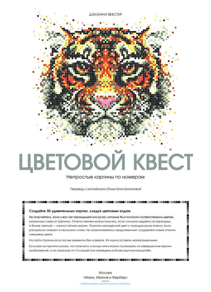Цветовой квест. Непростые картины по номерамВ данный момент этот товар отсутствует в продаже. Возможно, у нас найдется аналогичный или похожий товар здесь. Серия: МИФ. Творчество Создайте 30 удивительных картин, следуя цветовым кодам. |