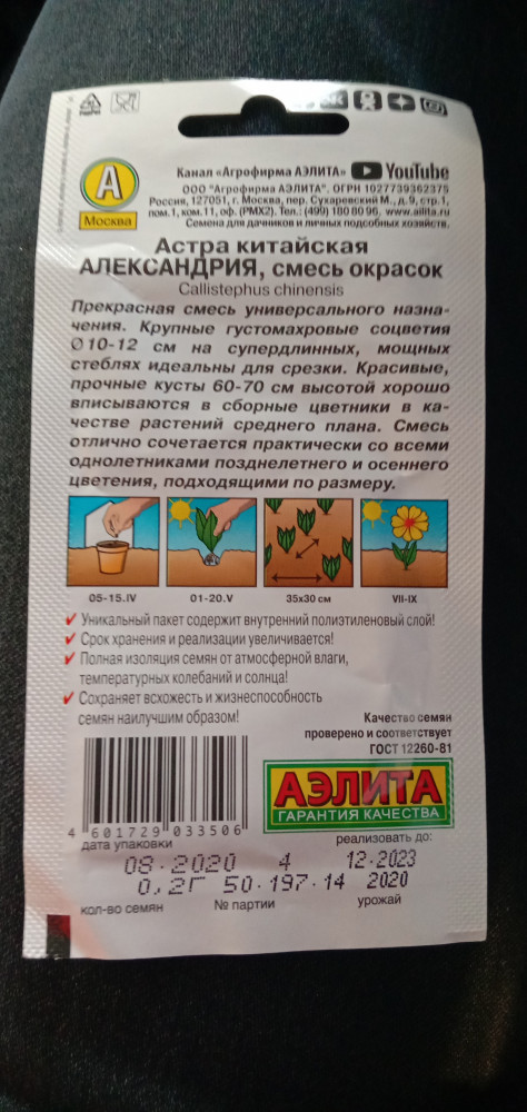 Аэлита Семена. Астра «Александрия», смесь окрасок+11 Всхожесть Упаковка