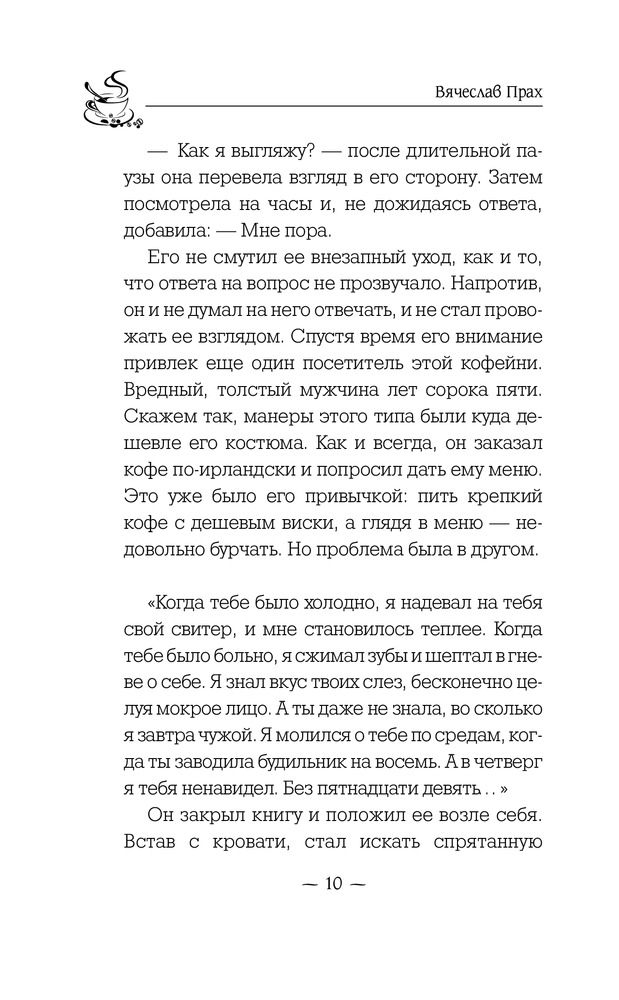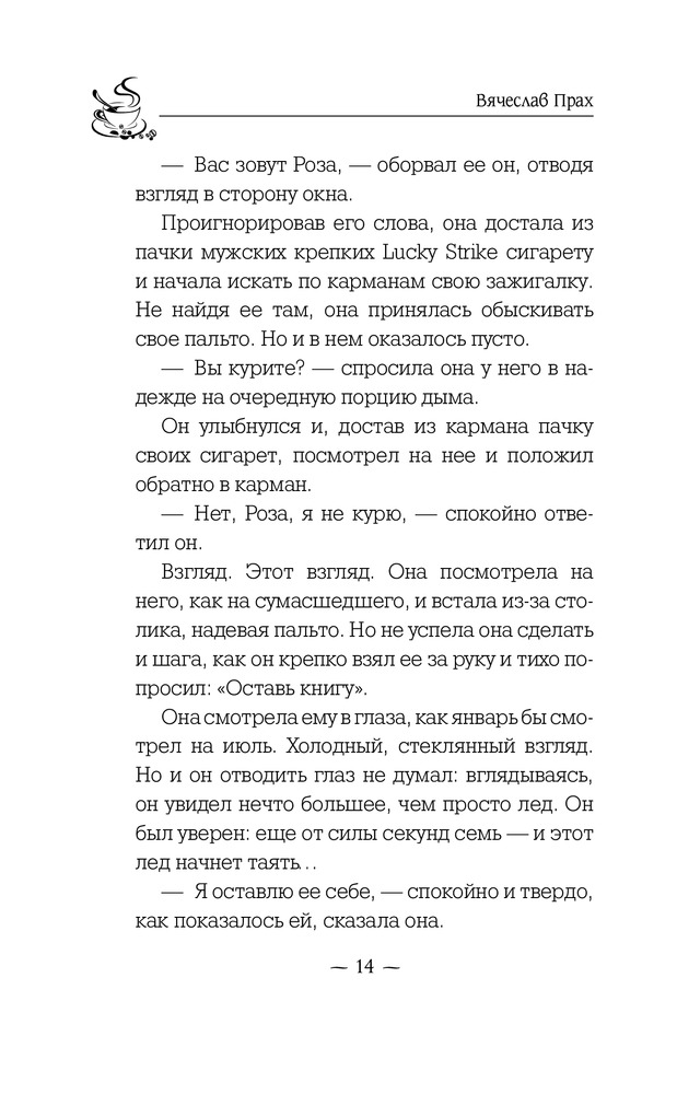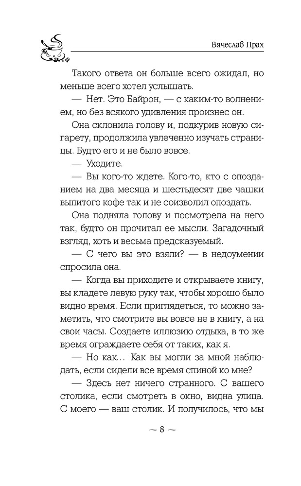 Эта книга стала моей любимой! Могу перечитывать её постоянно! Так же как и остальные кофейни! Читая каждую из книг ты открываешь для себя что-то новое. Прочитав вторую книгу я поменяла свое мнение, я многому удивлялась и говорила себе: так вот оказывается как все было... Потом узнав о появлении третий книги, я тут же купила и её и читая вновь узнавала что-то новое, что не увидела в первых двух. А вообще каждую книгу Вячеслава я читаю на одном дыхании, завороженная его историей, каждой строчкой, каждым персонажем, каждым моментом... Прах стал моим кумиром!