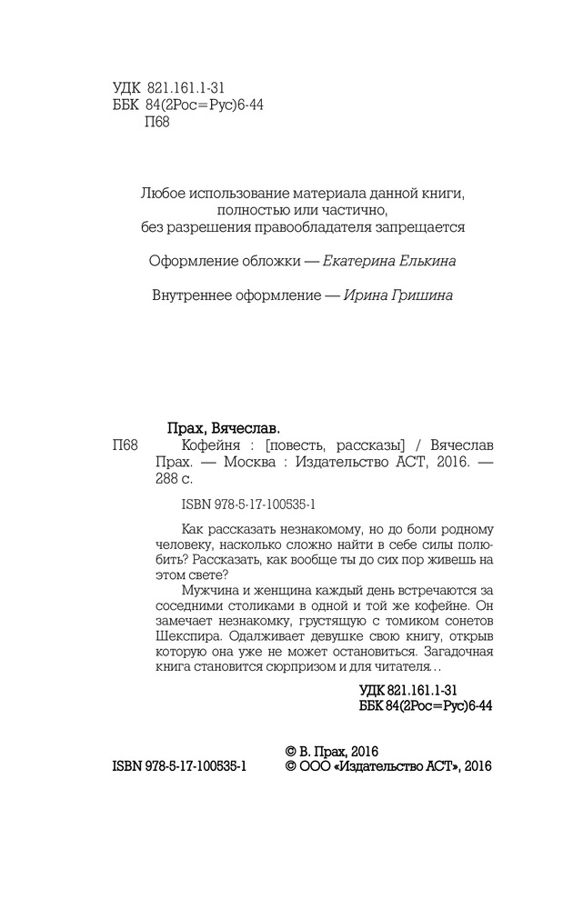 Сама книга отличного качества, шрифт крупный. Половину книги занимает рассказ "Кофейня", а остальную половину другие небольшие рассказы. Ожидала немного большего, но книга все равно впечатлить смогла.