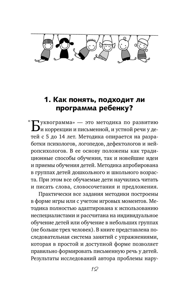 Сначала когда я прочла книгу, я подумала, какая глупость, 20 занятий, упражнения на дыхание, упражнения физические, и упражнения пальчиковые, чтение сказки и буквы проходить, точно это книга не для подростков, я занимаюсь с сыном непоседой 6 лет. Занятия очень короткие минут на 20. Но я решила, раз купила книгу, значит буду заниматься, попробую.... параллельно мы с ним занимаемся по Школе семи гномов для 6 лет.... одно занятие мы делаем 5 раз в неделю... одно и то же... и мне кажется, я вижу результаты - положительные... Через 4 месяца, когда пройдем курс полностью, напишу еще отзыв.