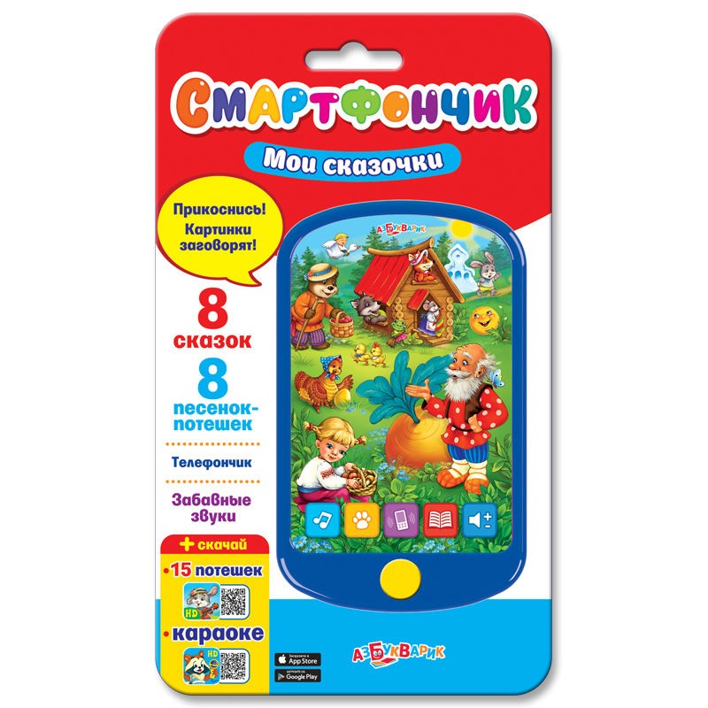 Азбукварик Смартфончик «Мои сказочки» (8 сказок, 8 песен-потешек, телефончик, забавные звуки)В данный момент этот товар отсутствует в продаже. Возможно, у нас найдется аналогичный или похожий товар здесь. Серия: Смартфончик Смартфончик «Мои сказочки» от компании «Азбукварик» является интерактивной игрушкой. Внизу большого экрана находятся 5 красочных иконок, при нажатии на которые смартфончик начинает издавать звуки. В зависимости от нажатой кнопочки игрушка рассказывает ребенку интересные сказки, поет веселые песенки. |
