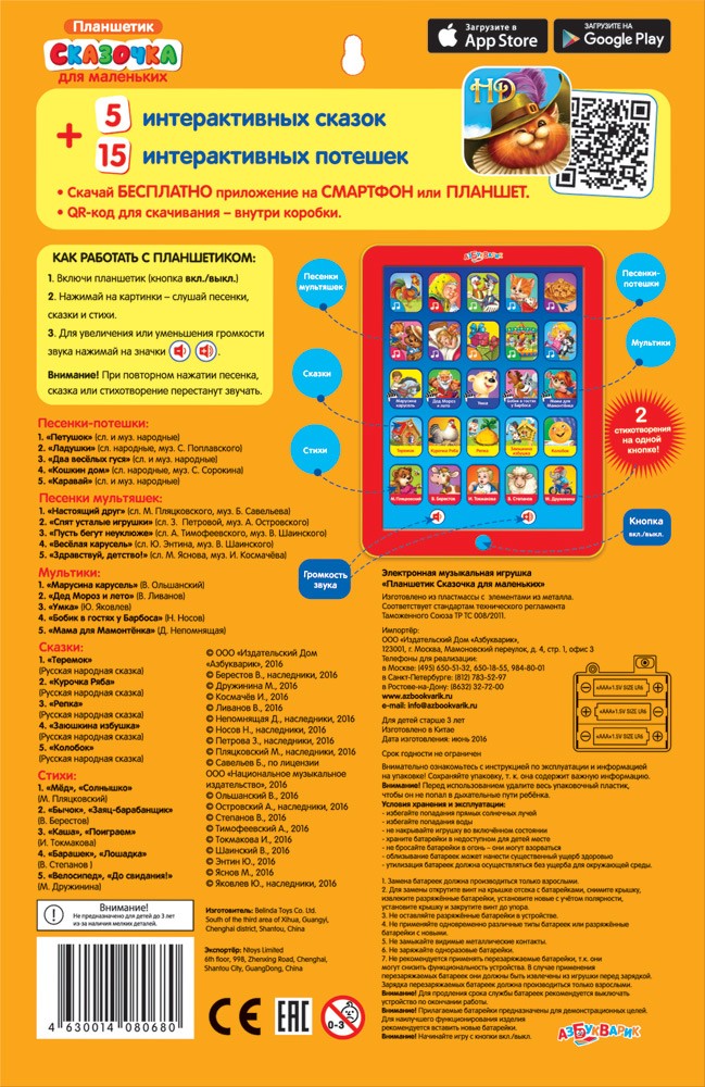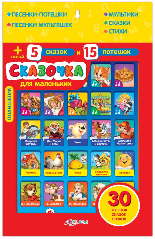 Бестселлер «Азбукварика» – планшетик Сказочка в новом варианте: для самых маленьких. В нем собраны любимые потешки, популярные детские песенки, русские народные сказки, стихи известных поэтов и мультики. Малыш сможет послушать истории про Умку и Мамонтёнка, выучить стихи М. Пляцковского и В. Степанова и спеть песенки с героями мультфильмов.