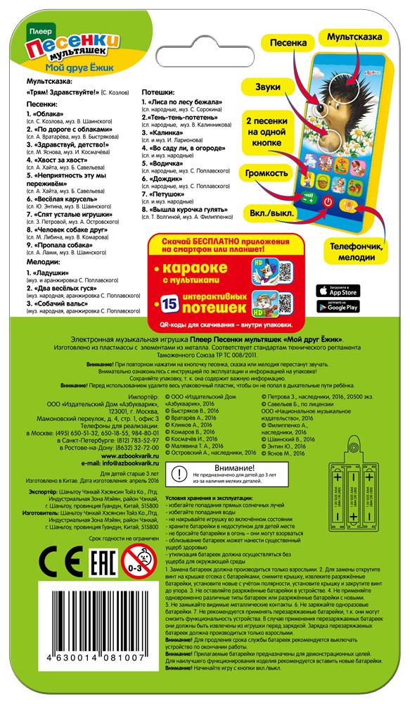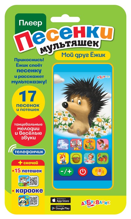 Азбукварик Детский плеер «Мой друг Ёжик»В данный момент этот товар отсутствует в продаже. Возможно, у нас найдется аналогичный или похожий товар здесь. Серия: Мультиплеер Интерактивный плеер-смартфончик с любимыми мультяшками! Прикоснись к Ёжику, и он расскажет сказки и споёт песенки. 17 песенок, танцевальные мелодии, забавные звуки и весёлый телефончик – в каждой игрушке. |