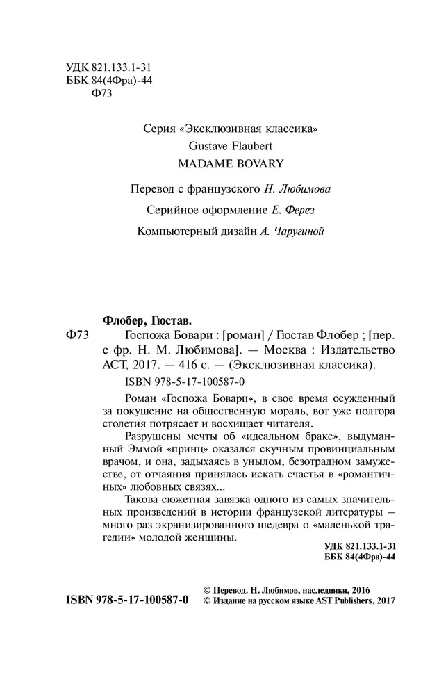 Роман не зря считается частью мировой литературной сокровищницы – очень сильная вещь! Героиня в погоне за призрачной любовью, за чувствами ломает жизнь себе и своим близким – мужу, ребенку. Эгоизм мадам Бовари просто зашкаливает, на протяжении всего романа она думает только о себе, о собственных чувствах, собственных переживаниях, собственных интересах. Проблемы выбора у нее не стоит – «хочу!» и все. Я очень зла на главную героиню, очень...надо же быть такой дурой!