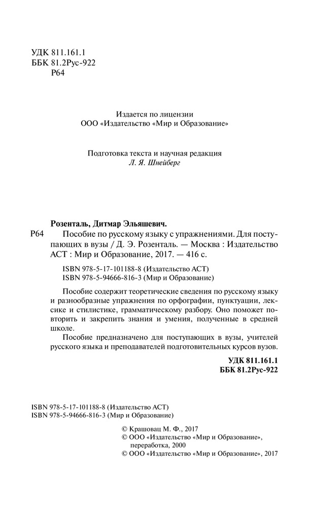 💳 Оплатить за товар можно при получении 🇰🇿 Есть бесплатная доставка по Казахстану от 1 дня 🎁 Копите бонусы с каждой покупки Серия: Розенталь Пособие содержит теоретические сведения по русскому языку и разнообразные упражнения по орфографии, пунктуации, лексике и стилистике, грамматическому разбору. Оно поможет повторить и закрепить знания и умения, полученные в средней школе. |