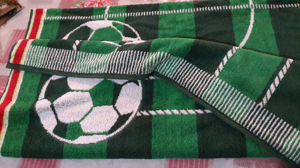 Махровое, качественное полотенце размером 70 на 140. Цвет яркий, красивый. Мужу подарила, он любит футбол. Был приятно удивлён ))