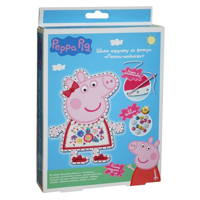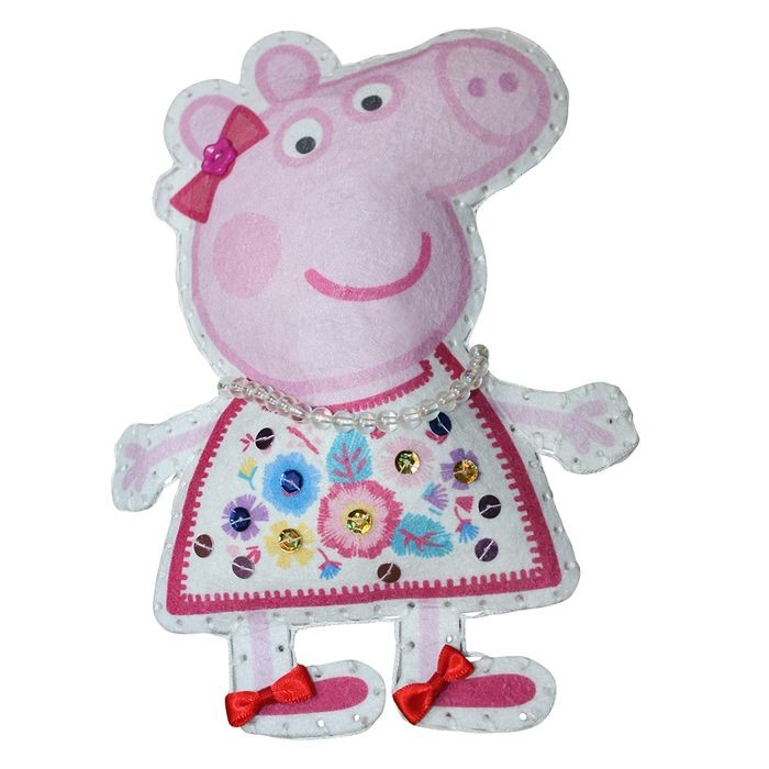 · В этом наборе представлены готовые детали из фетра, которые при сшивании ниткой и иголкой образуют фигурку героини популярного мультфильма – Свинки Пеппы.
