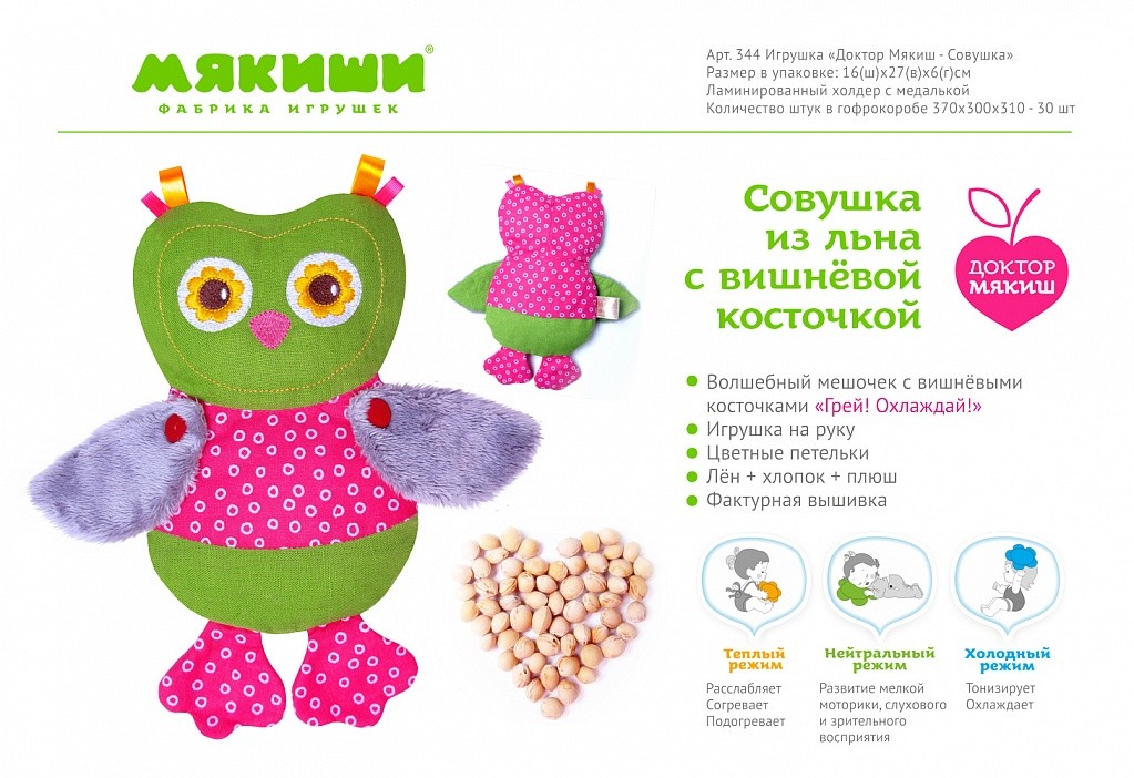Доктор Мякиш-Совушка — это уникальная льняная игрушка на руку с сюрпризом! Внутри Совушки мешочек с настоящими вишнёвыми косточками, который можно вынимать, нагревать в микроволновой печи и остужать в холодильнике. Благодаря чудесным свойствам вишнёвых косточек игрушку можно использовать в трёх температурных режимах: тёплом, холодном и нейтральном. Яркий образ Совушки, плюшевые крылышки на кнопках, тепло и приятный звук вишнёвых косточек способствуют эмоциональному и сенсорному развитию малыша.
