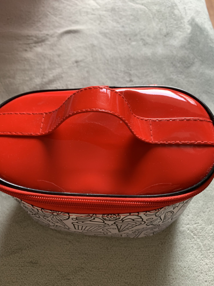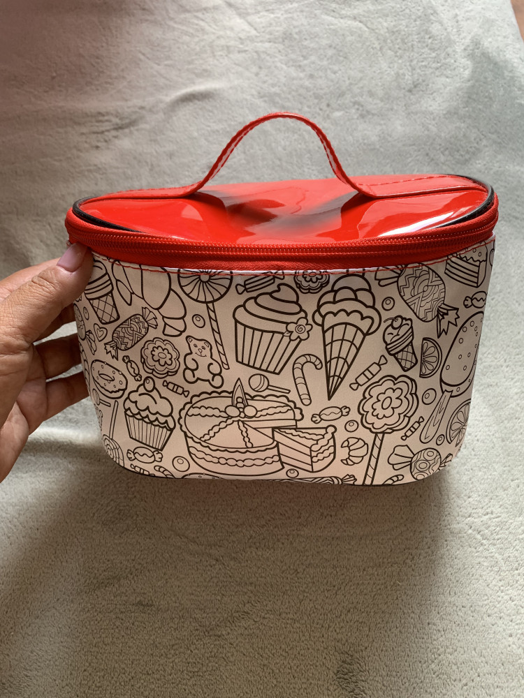 Косметичка соответствует описанию. Пока не раскрашивали и боюсь, если раскрасим неаккуратно, вид ее ухудшится. Боковинка тканевая, верх и низ глянцевый материал, типа кожзаменителя что ли.