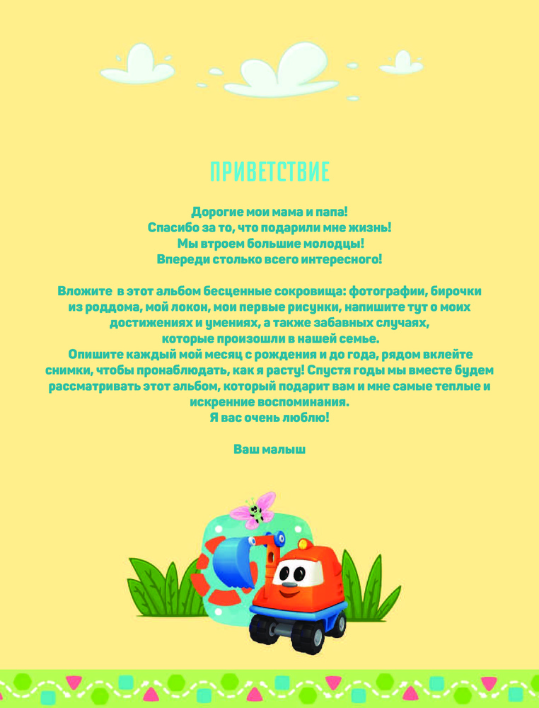 В этом вам поможет альбом, который вы держите в руках. Записывайте трогательные истории, вклеивайте фотографии, фиксируйте каждое памятное событие — и потом вы сможете раз за разом возвращаться в эти моменты, вспоминая их с теплотой и любовью.