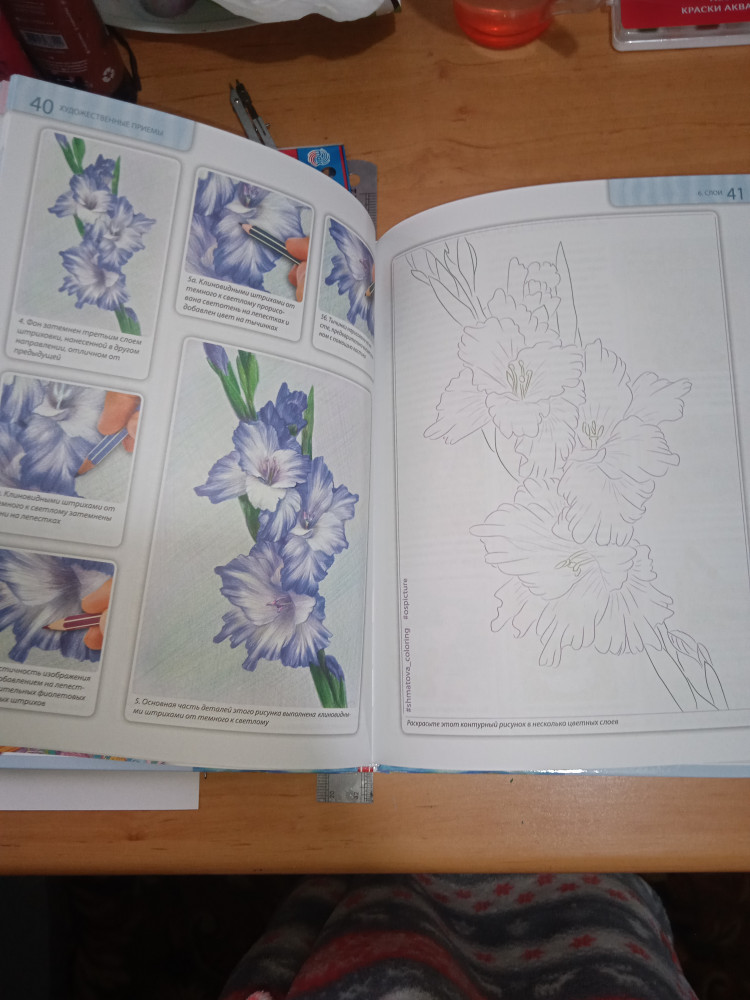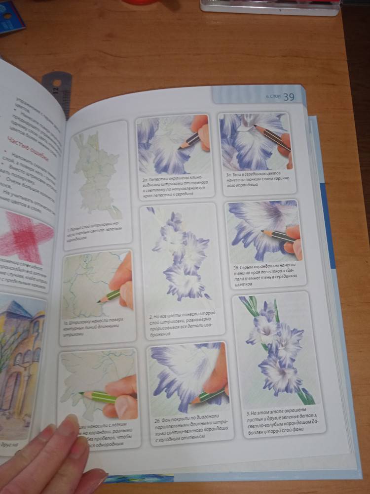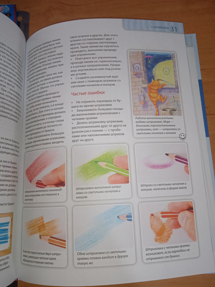 Отличный самоучитель, буду осваивать. Иллюстрации качественные, дано задание, рисунок, прям тут в книге нужно раскрасить, тут же пошаговая последовательность. Супер.