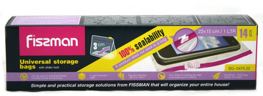 Fissman Универсальные пакеты с замком-слайдером (22х15 см) 14 шт.В данный момент этот товар отсутствует в продаже. Возможно, у нас найдется аналогичный или похожий товар здесь. Компания Fissman предлагает идеальный вариант в помощь при ведении хозяйства - гермитично закрывающиеся пакеты из плотного пищевого пластика. В первую очередь, пакеты предназначены для хранения пищевых продуктов в холодильнике и морозильной камере, в том числе жидких и сыпучих. Благодаря герметичной застежке, перспектива продлить жизнь продуктов порадует любую хозяйку. Еда не будет сохнуть и заветриваться, не будет впитывать посторонние запахи. На пакете предусмотрено информационное поле, в котором можно отмечать дату упаковки для хранения. Пакеты также можно использовать для экономии пространства при хранении различных мелочей. прозрачные стенки позволяют видеть, что храниться в пакете. |