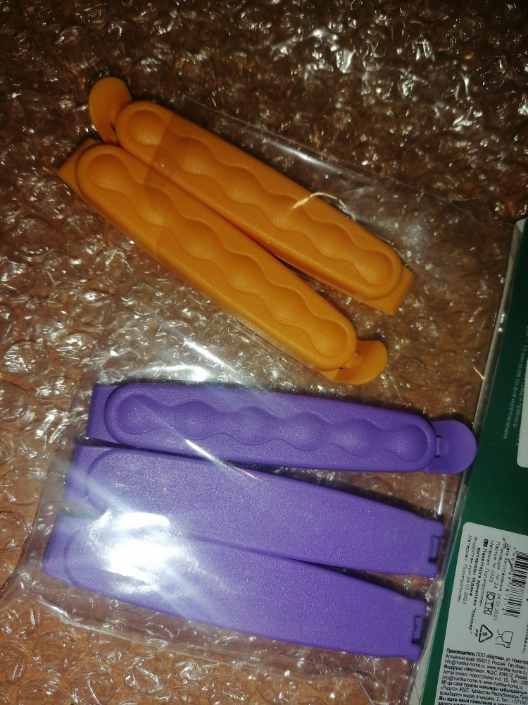 Зажимы классные, относительно длинные, крепкие, все целые. Чтобы хорошо закрыть ими нужно правильно подвернуть и завернуть край пакетика и потом уже скреплять, все тогда хорошо.