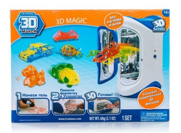 Комплект: 3D Magic Maker (устройство с ультрафиолетовой лампой), 3 тюбика с гелем (красный, оранжевый, зеленый), 3 формочки, 3 трафарета, 2 дополнительных трафарета для свободного моделирования, инструкция.