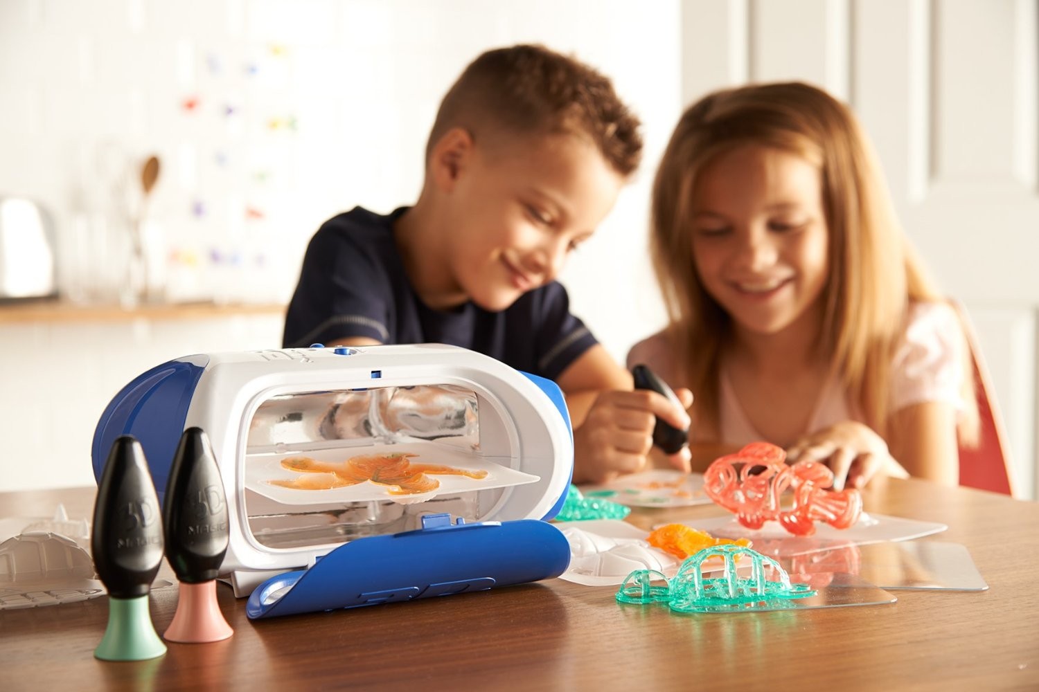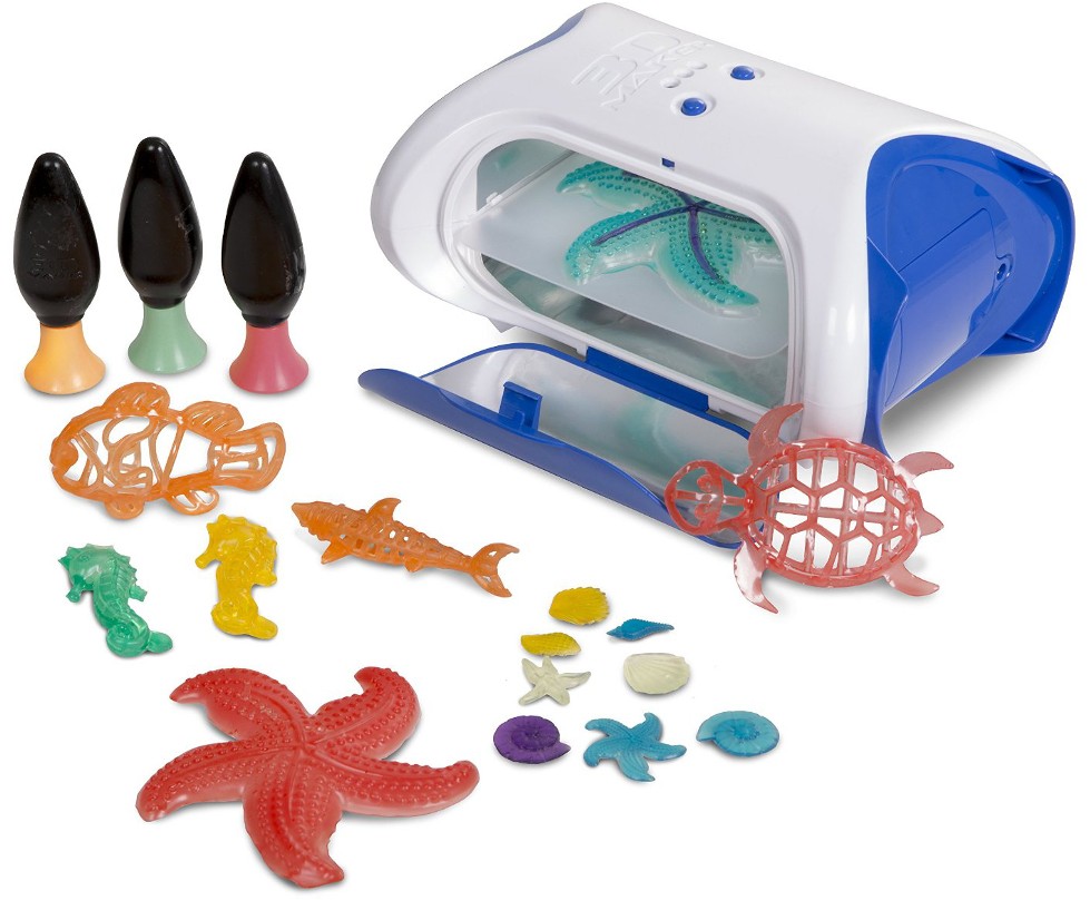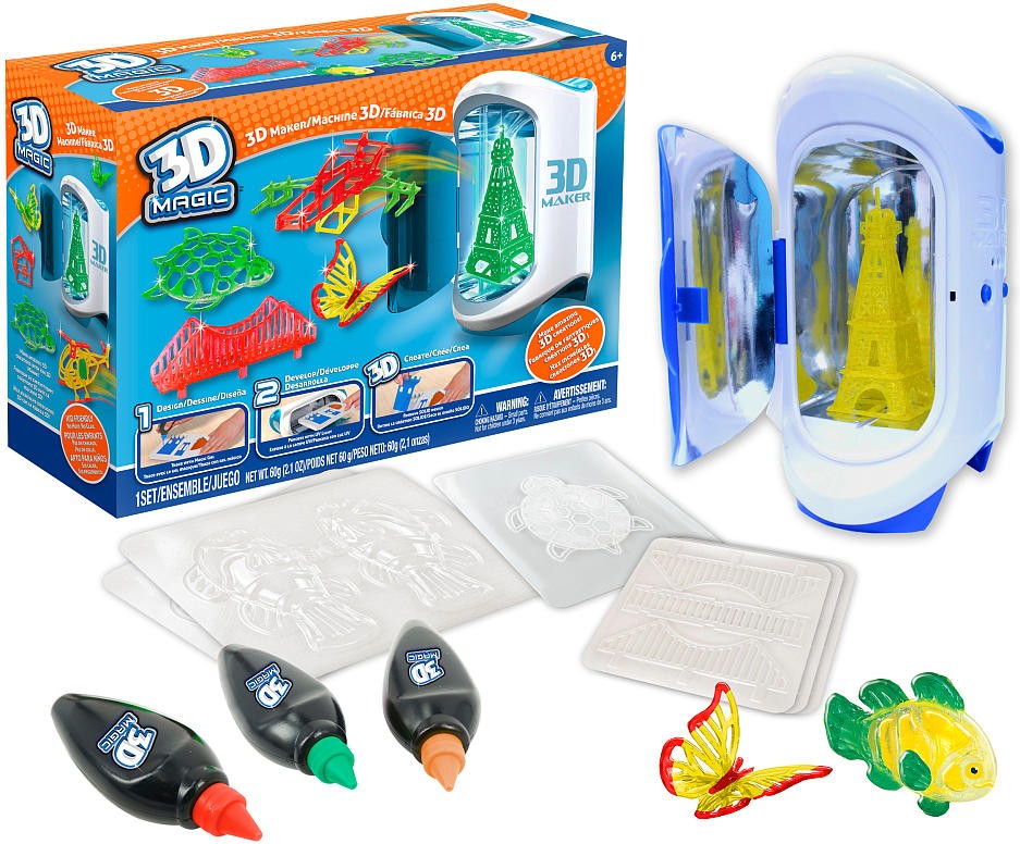 Для успешной работы в набор для творчества 3D Magic Maker входят трафареты и формочки, которые облегчат деятельность. Стоит заметить, что гель абсолютно безопасен, а ультрафиолетовые лучи также совершенно не навредят ребенку, поскольку весь процесс проходит с закрытой крышкой. Застывание пластика происходит за считанные минуты, само же устройство не станет занимать много места. В комплекте имеется все необходимое для незамедлительного начала работы!