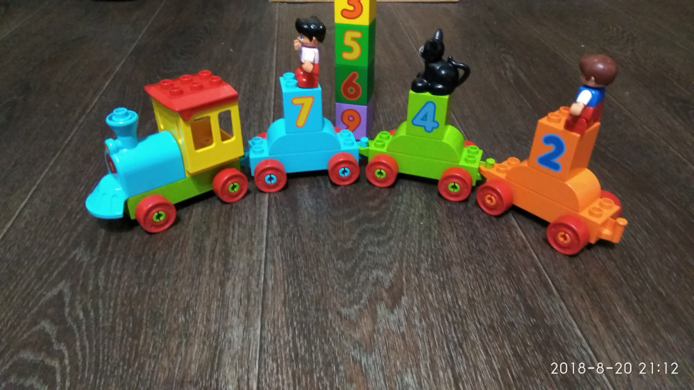 Отличный конструктор! Хороший пластик, детали плотно присоединяются. Ребенку 1.9 играет с удовольствием уже два дня. Можно придумать много игр. Изучать не только цифры, но и цвета радуги. В наборе 22 детали. Платформа с колёсами считается как одна деталь. Можно докупить пару зверят или человечков, чтобы было интереснее, когда на поезде много пассажиров. Товар рекомендую.